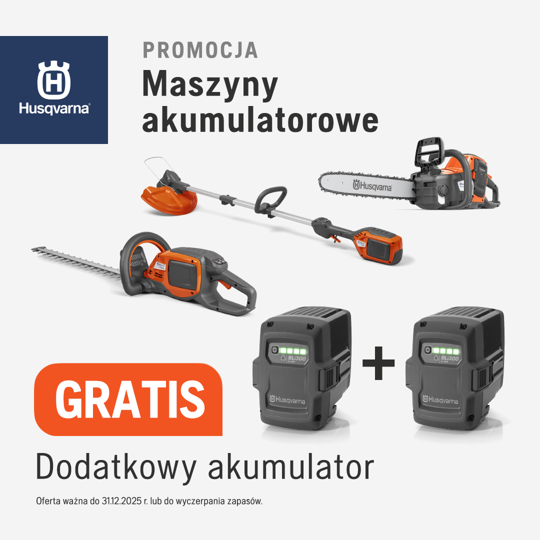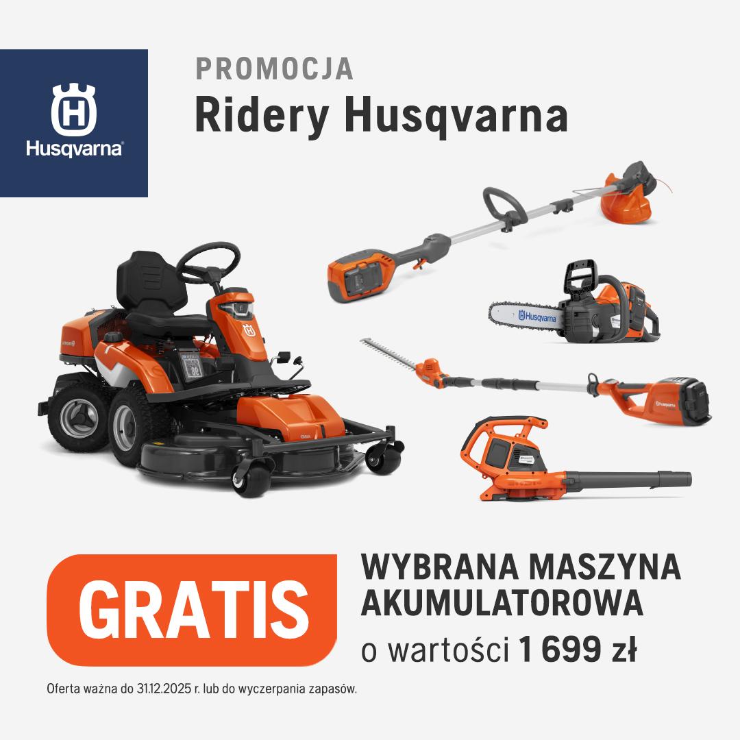 Tylko teraz, przy zakupie wybranych riderów Husqvarna, dodatkowa maszyna akumulatorowa gratis. Oferta ważna do 31.12.2025 roku lub wyczerpania zapasów.